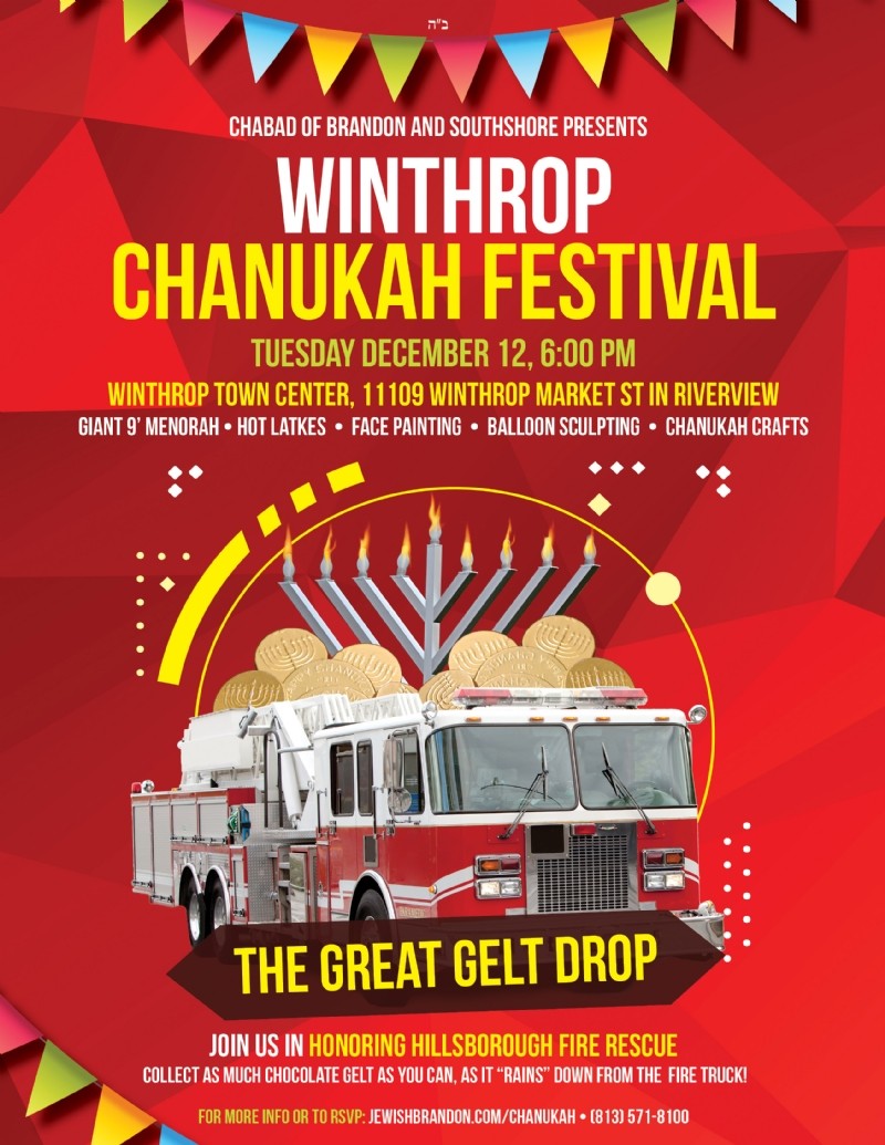 Join us in honoring Hillsborough Fire Rescue, collect as much chocolate Gelt as you can, as it "rains" down from the fire truck!
