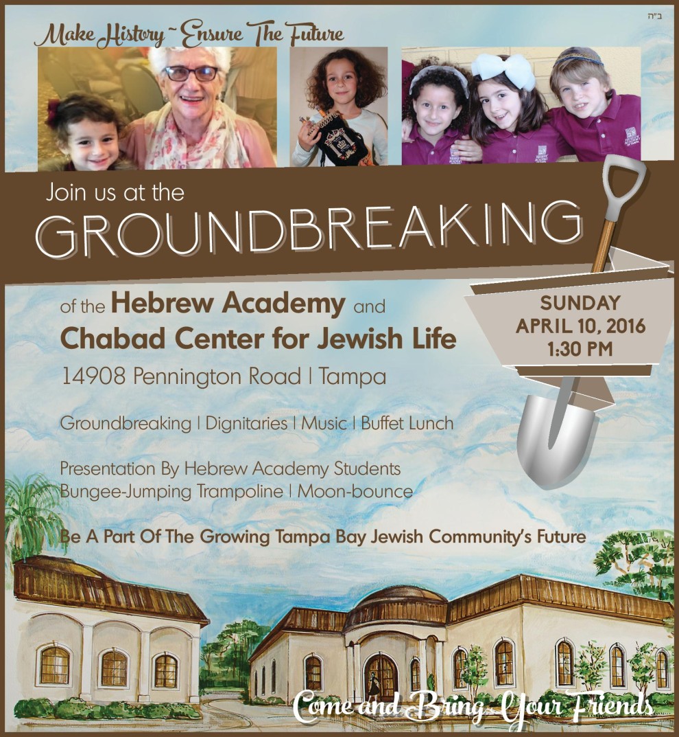 Join us at the groundbreaking for the new Hebrew Academy building and the expansion of Chabad Center For Jewish Life @ Chabad of Tampa Bay! Sunday April 10 @ 1:30