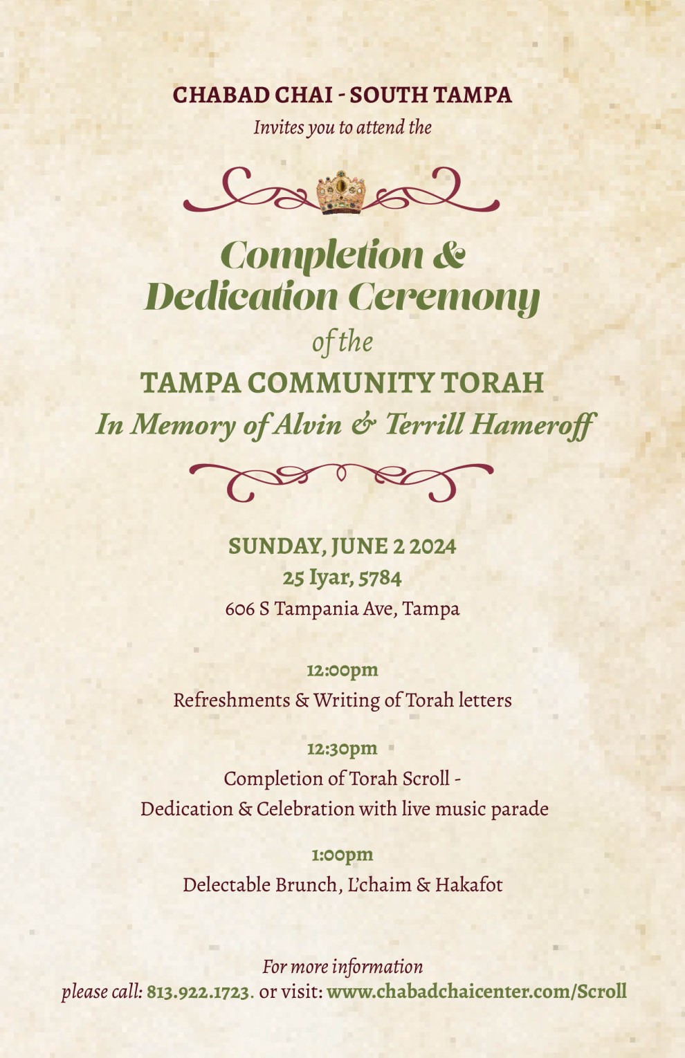 A new Torah scroll is a sign of a vibrant community – a healthy, robust, and flourishing community that is brimming with Jewish pride. At a time when the world is facing increased darkness, hatred, and hostility; here in Tampa, we are writing a new chapter in Jewish history - we hope you will be part of it!