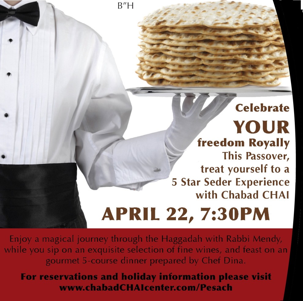 Enjoy a magical journey through the Haggadah with Rabbi Mendy, while you sip on an exquisite selection of fine wines, and feast on an gourmet 5-course dinner prepared by Chef Dina.