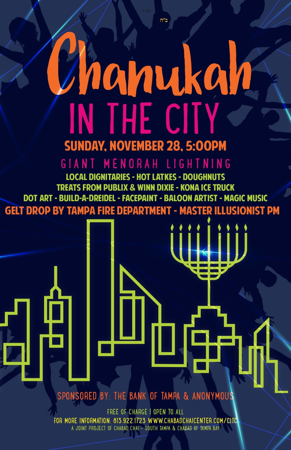 Join us for a Chanukah Festival as we light up the night in Downtown Tampa. Sunday, November 28, 5:00 - 7:00pm @ City Hall Plaza 315 E Kennedy Blvd