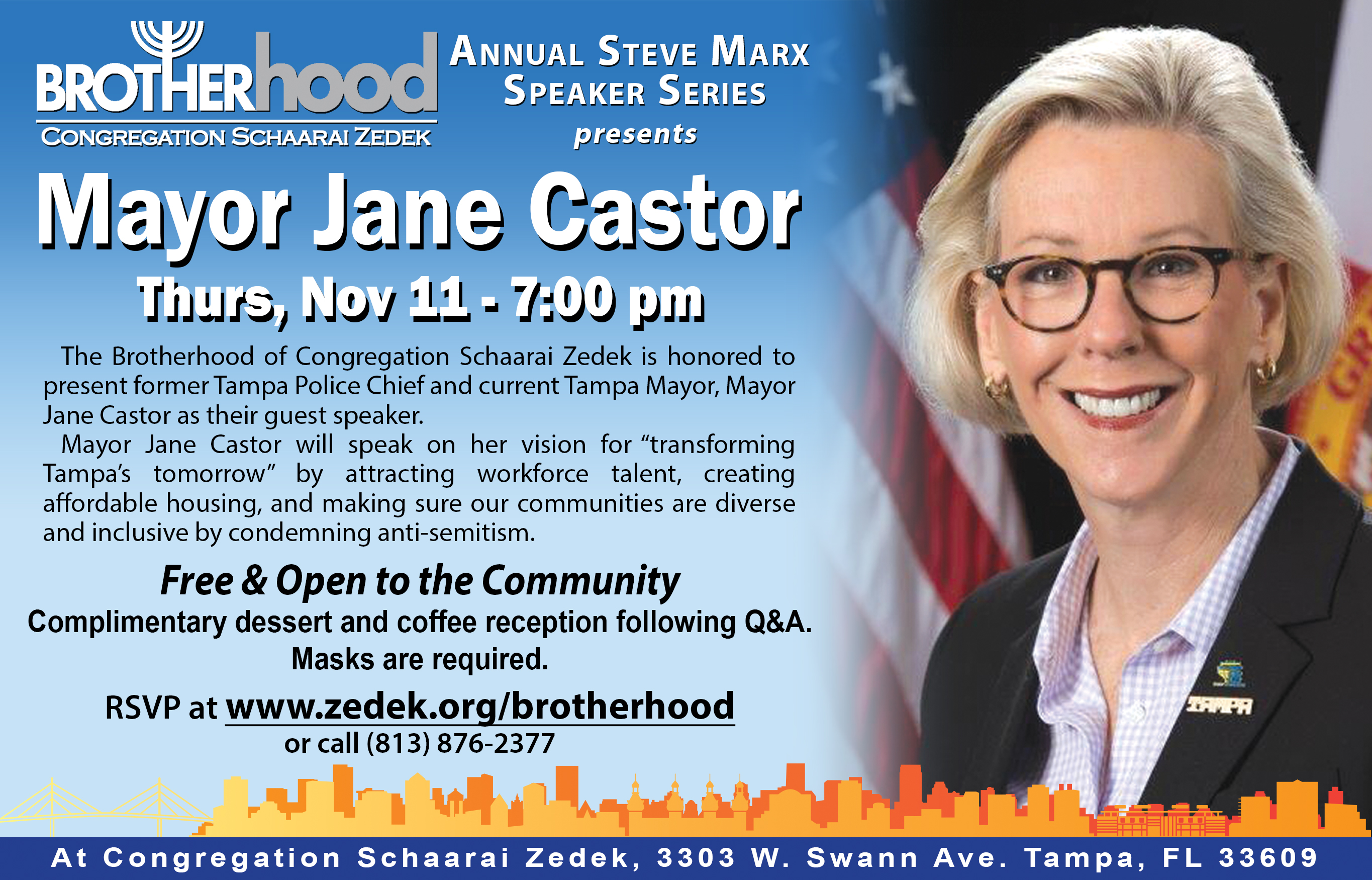 Congregation Schaarai Zedek Brotherhood’s Annual Steve Marx Speaker Series returns on Thursday, November 11, 2021, at 7 PM. Brotherhood is honored to present former Tampa Police Chief and current Tampa Mayor, Mayor Jane Castor as their guest speaker.