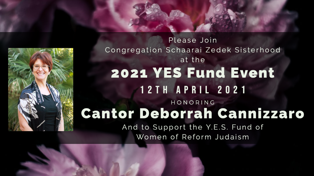 Please join Congregation Schaarai Zedek Sisterhood at the 2020 YES Fund Event on Monday, April 12, 2021, at 11:30 a.m., honoring Cantor Deborrah Cannizzaro and supporting the YES Fund of Women of Reform Judaism.